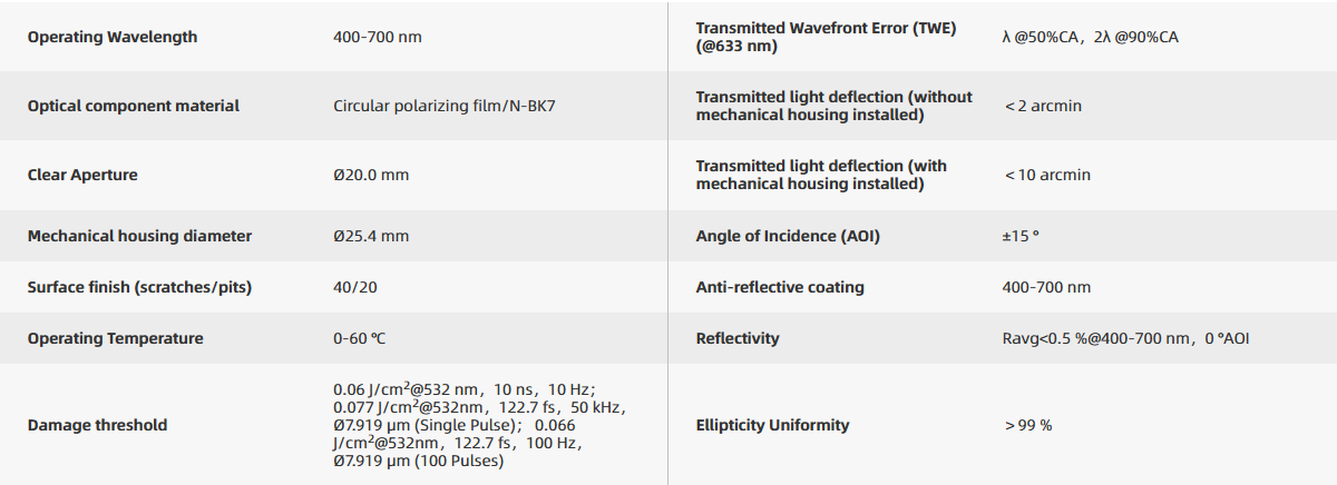 The Tuniu Economy Thin Film Circular Polarizer adopts a sandwich structure, consisting of a film and two N-BK7 windows, pre-installed in a metal housing. The film is composed of a linear polarizing layer and a λ/4 waveplate layer, with both air-contacting surfaces and the window plates coated with broadband anti-reflection coatings (400 nm-700 nm). The circular polarizer can convert incident natural light or light of any polarization state into left-handed or right-handed circularly polarized light, and can also transform left-handed or right-handed circularly polarized light into linearly polarized light. Since this polarizer is highly sensitive to stress, it is mounted in a metal retaining ring to prevent performance degradation during improper installation. There are two scale lines on the front side of the Tuniu Economy Thin Film Circular Polarizer's metal retaining ring, indicating the transmission direction of the internal linear polarizing component. When the light beam is incident from the side with the scale lines, the emergent light is circularly polarized. The economy thin film circular polarizer can meet the requirements of most circular polarization-related applications. If you have higher demands for ellipticity, we also offer custom high-performance thin film circular polarizers. For details, please consult Tuniu Technical Support.