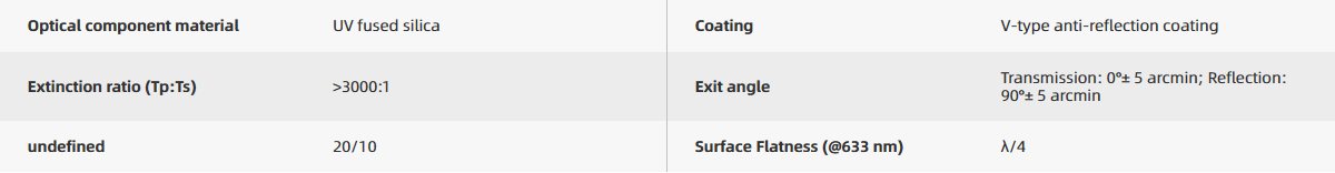 Tuniu offers 10 design wavelength options of 405 nm, 532 nm, 633 nm, 780 nm, 808 nm, 830 nm, 850 nm, 1030 nm, 1064 nm, and 1550 nm. The prism marked with a black dot on top indicates that its hypotenuse face is coated with a dielectric polarizing beamsplitter coating, which reflects S-polarized light and transmits P-polarized light. Any of the four sides can serve as the incident surface to separate P-polarized and S-polarized light. For optimal polarization performance, it is recommended that the incident light enters from the right-angle side of the prism coated with the polarizing beamsplitter coating.