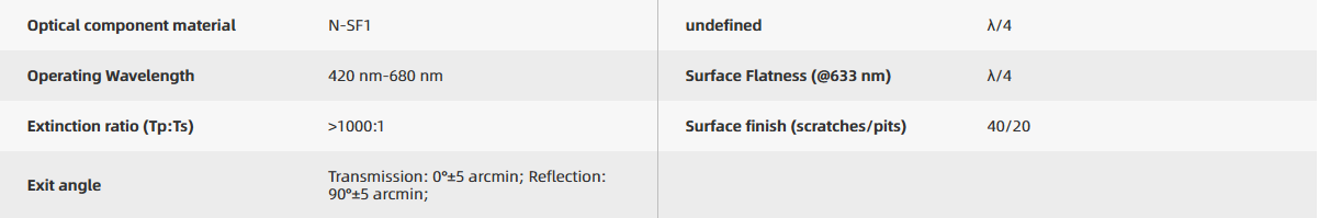 The Tuniu Broadband Polarizing Beamsplitter Cube consists of two right-angle prisms. The prism with a black dot on top indicates that its hypotenuse is coated with a dielectric polarizing beamsplitter coating, which reflects S-polarized light and transmits P-polarized light. Any of the four sides of the cube can serve as the incident surface to separate P-polarized and S-polarized light. For optimal polarization performance, it is recommended that the incident light enters from the right-angle side of the prism coated with the polarizing beamsplitter coating. Tuniu offers polarizing beamsplitter cubes made of N-SF1 material in various sizes, with four anti-reflection coating options of 420 nm-680 nm, 620 nm-1000 nm, 900 nm-1300 nm, and 1200 nm-1600 nm. All our optical components are finely processed and undergo strict quality control to ensure that Tuniu provides the users with high-quality optical products at reasonable prices.