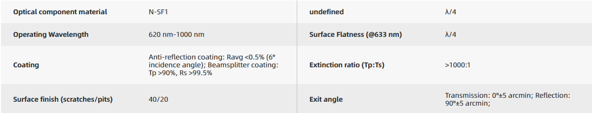 All four sides of the Tuniu Unmounted Polarizing Beamsplitter Cube are coated with anti-reflection coatings (Ravg<0.5%). One of the right-angle prisms has a hypotenuse coated with a beamsplitter coating, and a black dot is marked with a pencil on the frosted top surface of this prism. For optimal optical performance, it is recommended to have the light incident from the right-angle face of the prism with the beamsplitter coating. Tuniu offers cube adapter mounts in various sizes. When clamping the cube, the overall dimension is 25.4 mm. When used with the Cube Mount CM-3, it is compatible with the 30 mm coaxial systems.