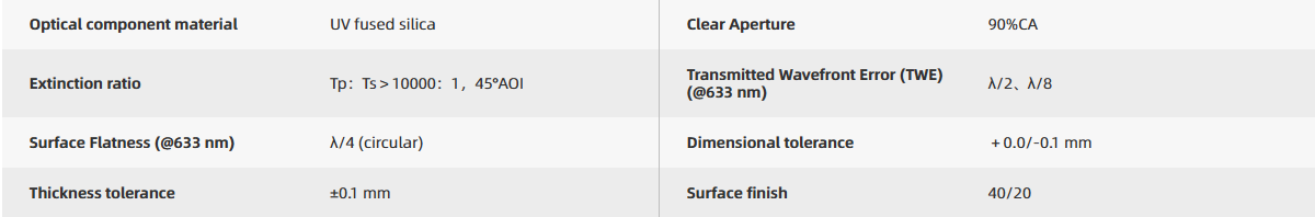l Dual-sided narrowband polarizing beamsplitter coating design, with an extinction ratio of Tp:Ts > 10000:1 at 45° incidence angle