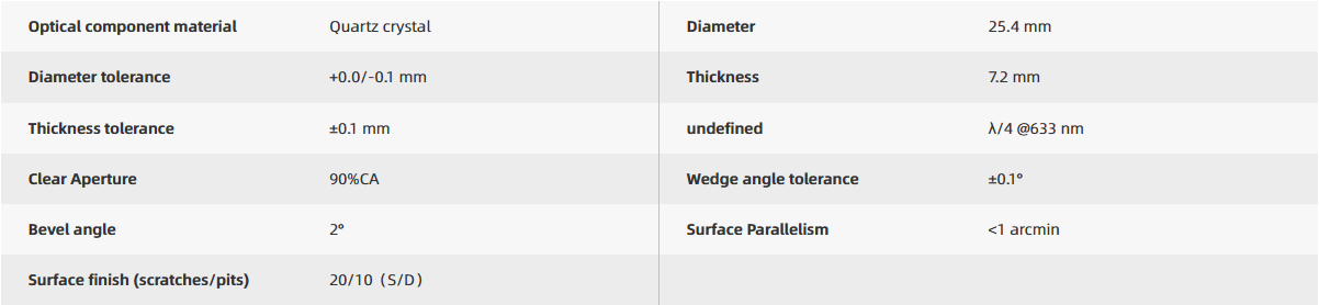 The Tuniu Achromatic Depolarizer consists of two circular quartz wedge crystals, with the optical axes of the two crystals at a 45° angle to each other. The thickness ratio between the thick wedge crystal and the thin wedge crystal is 2:1, and the crystals are bonded together using the UV-curing adhesive. The achromatic depolarizer is a passive polarization component that converts the polarized light into the unpolarized light. For the monochromatic light, when a linearly polarized monochromatic beam with a certain diameter passes through the achromatic depolarizer with a gradient phase difference, the phase difference or rotation angle of the emergent light varies at different positions, resulting in different polarization states of the beam. This alters its ordered state, reducing the degree of polarization of the emergent light. For the broadband light, as the incident light contains various wavelengths, passing through the achromatic depolarizer with a certain gradient phase difference introduces different phase delays, transforming the emergent light into elliptically polarized light with varying ellipticities. The entire beam becomes a synthesis of random states, causing the emergent light to appear depolarized, i.e., achieving an integrated depolarization effect in the frequency domain. The depolarization performance of the achromatic depolarizer is related to the operating wavelength, material, angle between optical axes, and prism wedge angle. Light emerging from an achromatic depolarizer exhibits a deterministic state, in contrast to natural light, whose polarization state is random. Generally, as long as no single polarization state dominates, the depolarization effect is considered achieved. Achromatic depolarizers are widely used in laser processing, fiber-optic gyroscopes, fiber-optic sensors, high-precision spectrophotometers, photoelectric detection technologies, Raman amplifiers and etc. Currently, Tuniu achromatic depolarizers are mainly divided into two uncoated and coated versions. The uncoated versions cover a wavelength range of 190 nm–2500 nm, while the coated versions are available within the ranges of 400 nm–700 nm, 700 nm–1100 nm, and 1100 nm–1650 nm.