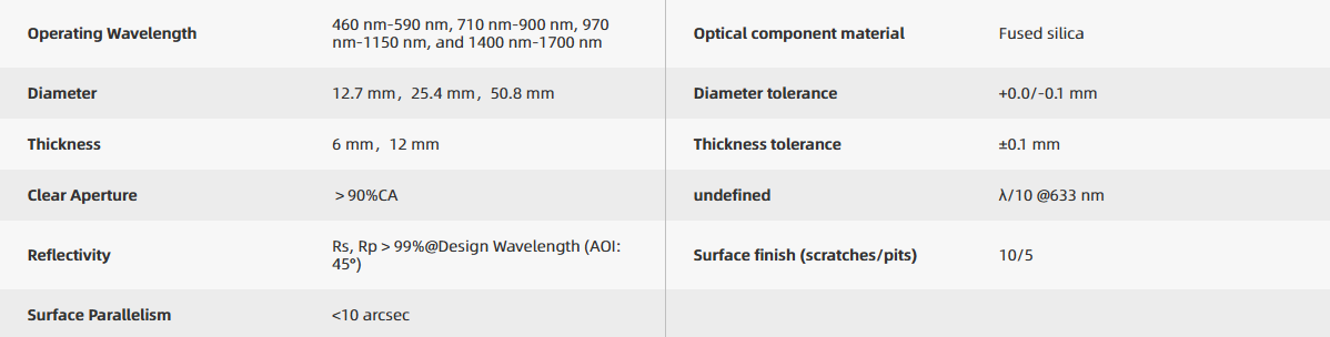 The substrate material of Tuniu ultrafast mirrors is fused silica, with a high-reflectivity coating on the surface that consists of low group delay dispersion dielectric films, deposited using ion beam sputtering (IBS) technology. During the ion beam sputtering process, a high-energy electric field accelerates the ion beam toward the target, causing ions to be sputtered from the target and release more ions, which ultimately deposit as a coating on the rotating substrate. The use of ion beam sputtering enables high repeatability in batch coating and low coating thickness errors, ensuring the designed wavelength range and low group delay dispersion. Fused silica has a lower coefficient of thermal expansion and extremely high thermal shock stability, making it particularly suitable for high-power femtosecond pulse lasers and imaging applications. Note: The direction indicated by the side marking arrow points to the coated surface. Tuniu ultrafast mirrors are available in four working wavelength ranges: 460 nm–590 nm, 700 nm–930 nm, 970 nm–1150 nm, and 1400 nm–1700 nm. With a 45° angle of incidence, the reflectivity exceeds 99.5%.