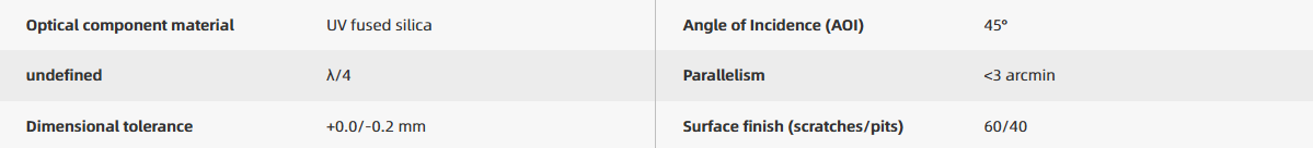 Tuniu dichroic mirrors can separate light beams based on wavelength. Shortpass dichroic mirrors transmit light beams below the cut-off wavelength while reflecting those above it, featuring high transmission and high reflection characteristics. Our dichroic mirrors offer various cutoff wavelengths to choose from, with average transmission and reflection rates exceeding 90% within the specified wavelength range. One surface of the dichroic mirror is coated with a filter coating, while the other side has an anti-reflection coating, with the arrow indicating the filter-coated surface.