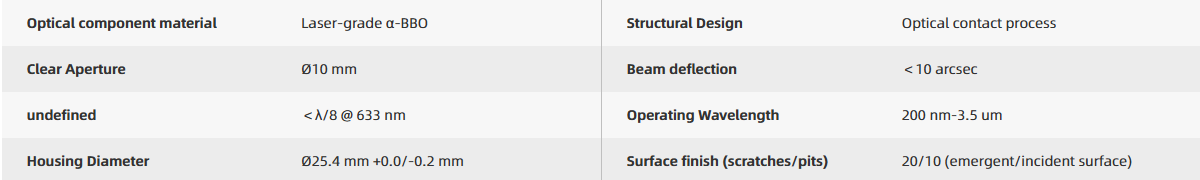 The Tuniu Rochon Prism is a polarization device composed of two negative uniaxial crystal prisms (calcite or α-BBO) with mutually perpendicular optical axes, bonded together through adhesive bonding or optical contact process. When the natural light is incident, two beams of linearly polarized light with orthogonal polarization directions and a certain separation angle can be obtained at the transmission end of the prism.