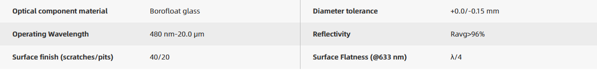 Metal-coated concave mirrors are highly suitable for beam focusing or collimation of broadband light sources and beam collection, offering high reflectivity across a wide spectral range. The reflection of light beams occurs on the metal-coated surface, which does not introduce chromatic aberration. However, metal coatings are prone to oxidation, discoloration, or peeling in high-humidity environments. Tuniu's metal-coated mirrors feature a protective silicon dioxide layer on the surface to prevent direct contact between the metal coating and air. Although the protective layer can prevent silver oxidation, silver-coated mirrors are still not suitable for use in high-humidity environments. They must be used and stored in room-temperature conditions with minimal humidity. Tuniu offers three types of metal-coated mirrors: aluminum-coated, silver-coated, and gold-coated. All our mirrors undergo precision processing and strict quality control to ensure that Tuniu provides high-quality lens products at reasonable prices. For customized metal-coated mirror requests, please contact Tuniu technical support.