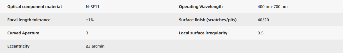 Tuniu biconcave lenses have a negative focal length and are commonly used in applications such as imaging or beam collimation. Since N-SF11 has a lower Abbe number, Tuniu chooses to use RoHS-certified N-SF11 to manufacture lenses with various smaller focal lengths. Additionally, N-SF11 lenses are more suitable for particularly harsh (acidic or alkaline) environments. All circular lenses from Tuniu come pre-installed with standard lens sleeves or lens mounting adapters. These mechanical components are engraved with product model, type, diameter, and focal length on the housing for easy identification.