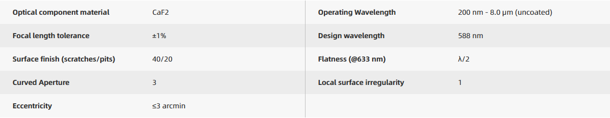 Tuniu double-concave lenses have a negative focal length and are commonly used in applications such as imaging or beam collimation. Tuniu chooses to use CaF2 to manufacture various lenses. CaF2 exhibits high transmittance in both ultraviolet and infrared spectral ranges, along with an extremely high damage threshold, making it widely applicable in the excimer laser industry. All circular lenses from Tuniu come pre-installed with standard lens sleeves or lens mounting adapters. These mechanical components are engraved with product model, type, diameter, and focal length for easy identification of lens parameters by users.